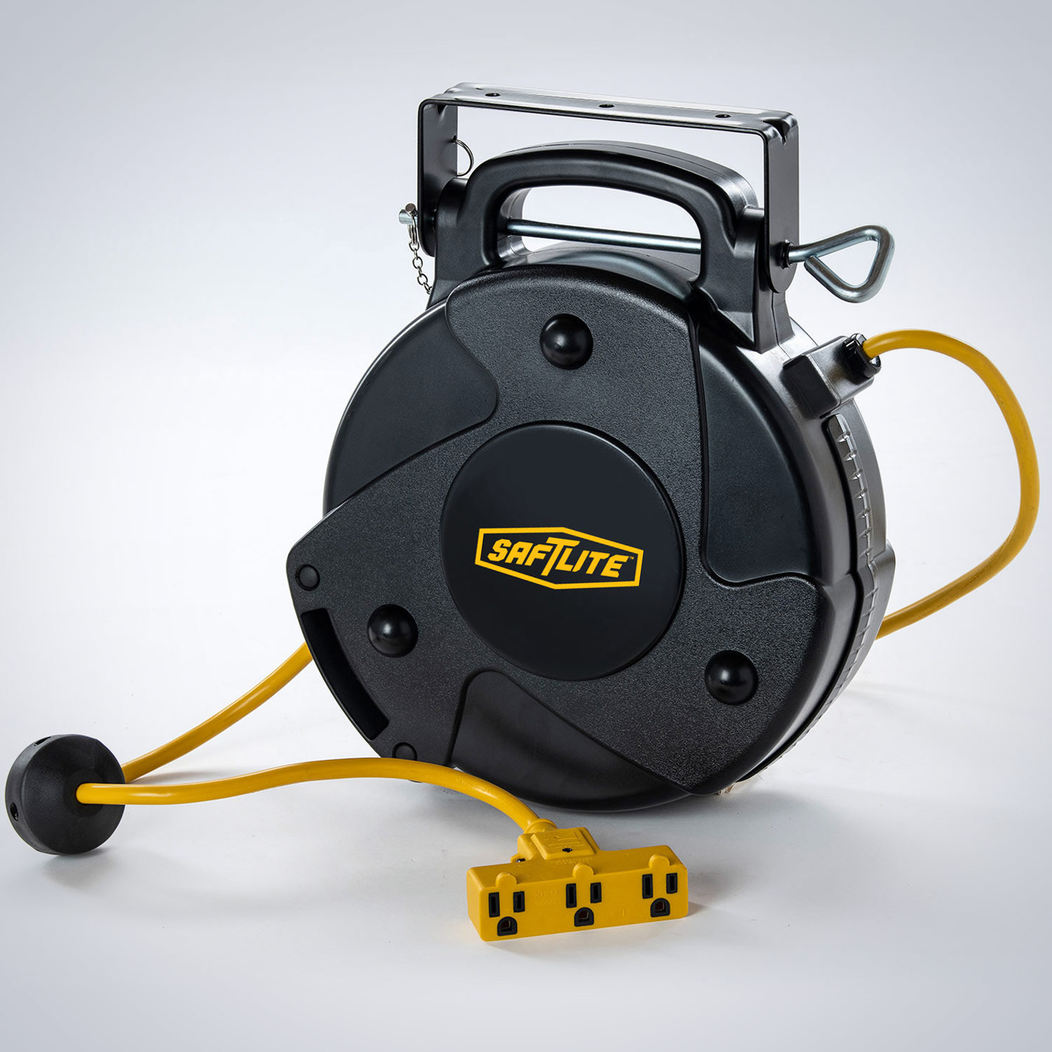 Midsize power supply reels deliver power where you need it. Mount them on the ceiling, wall or work bench. Remove the locking pin and take it with you. There are several outlet options to choose from: triple or quad tap outlet with circuit breaker and our Saf-T-Lok outlet.
